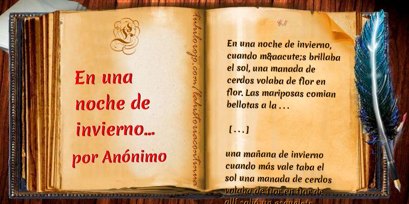 En una noche de invierno, cuando más brillaba el sol, una manada de cerdos volaba de flor en flor. Las mariposas comian bellotas a la sombra de un manzano. Un pobre ciego, en una piedra de madera, leía un periódico sin letras, a la luz de un candil apagado, que decía: